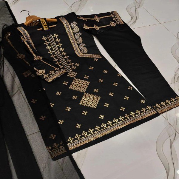 Upgrade your wardrobe with this elegant black 3-piece cotton suit featuring beautiful sequin embroidery and a lightweight chiffon dupatta. Perfect for Eid, weddings, and formal gatherings, offering comfort with a stylish festive look.