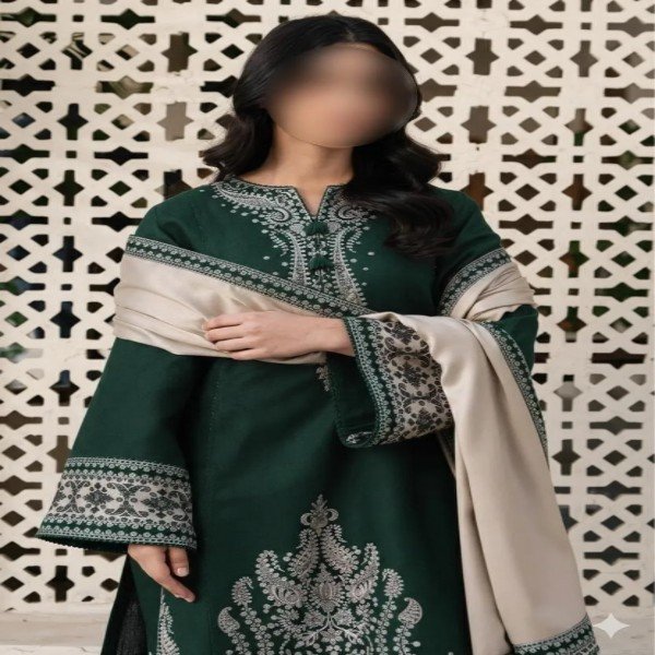 Look beautiful and feel confident this Eid with this elegant 3-piece unstitched suit. The rich green color gives a classy and graceful vibe, while the white embroidery on the shirt, sleeves, neckline, and border adds a timeless touch.